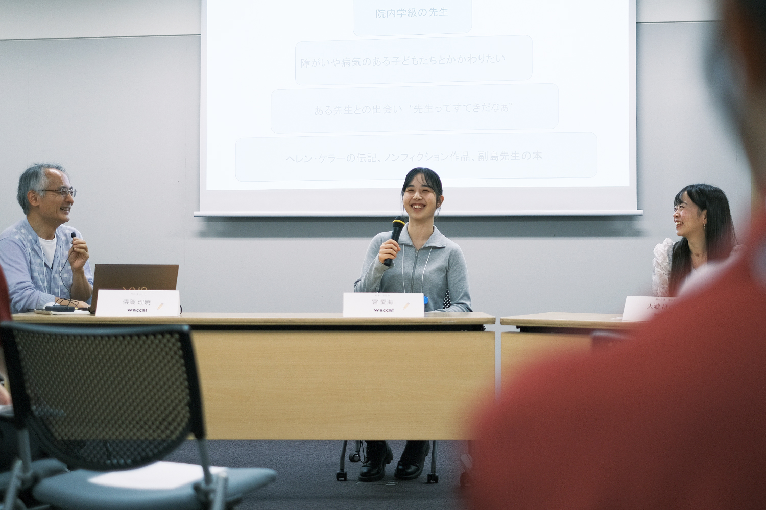 学生時代に考えていたこと、何を大切に進路を決めたか。日々の仕事で大切にしていること、葛藤などなど……儀賀さんや学生のみなさんからの、病気療養中の子どもたちと関わるwacca!のメンバーだからこその問いに対して、一つずつ、自分の気持ちやこれまでの関わりを振り返りながら、丁寧にことばを紡ぐ先輩方の姿が印象に残っています。