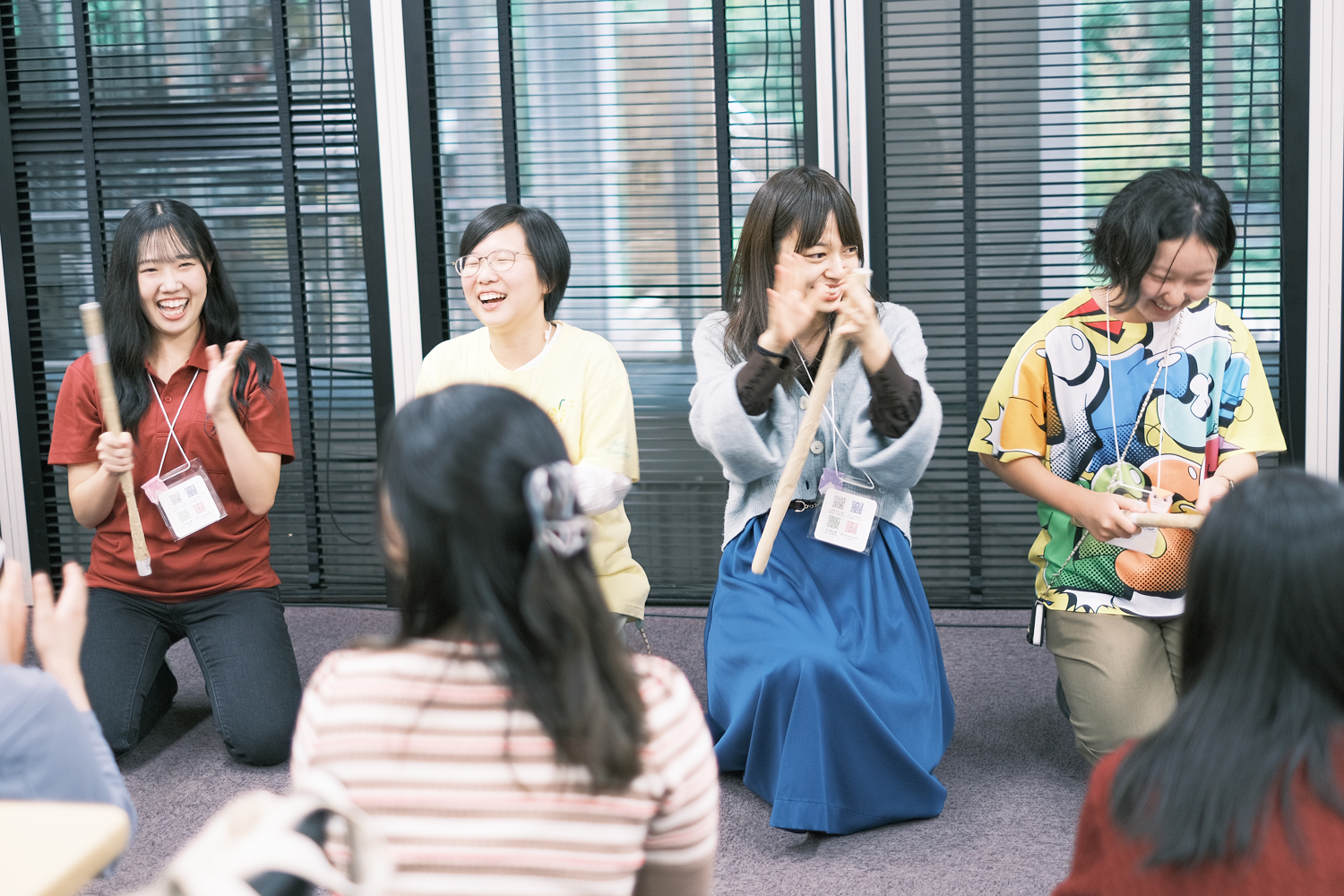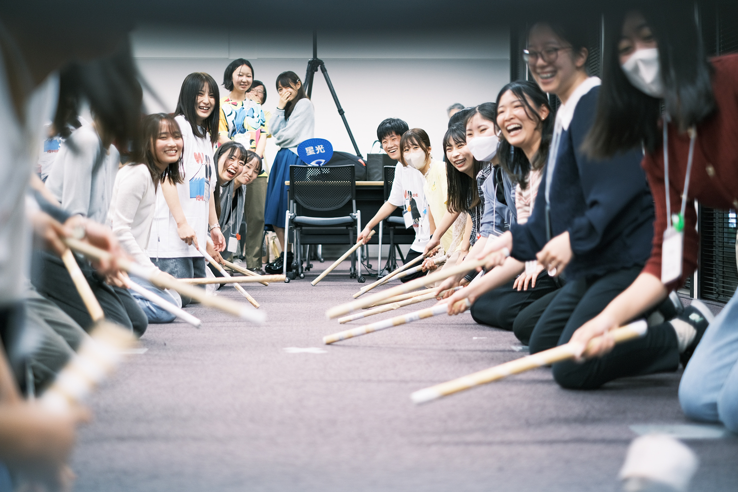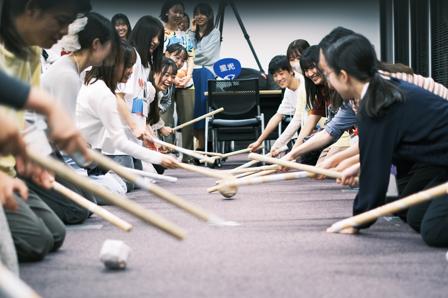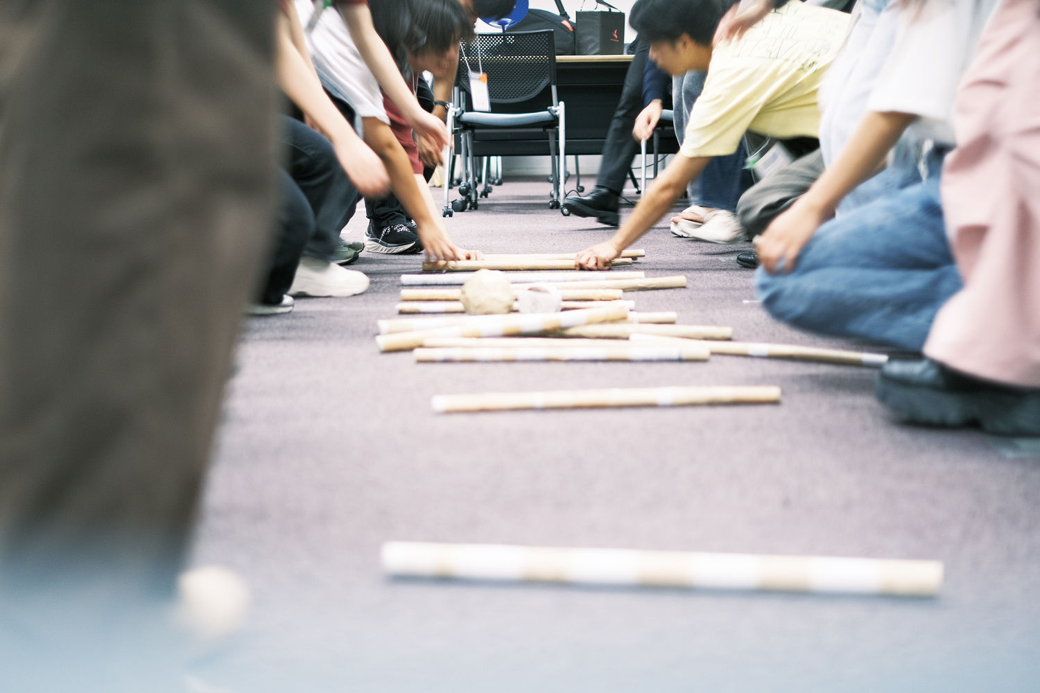 大阪教育大学 西遊子さんのリードで、アイスブレイクとしてみんなで「棒サッカー」に挑戦。棒やボール、フィールドやルールもみんなでつくりながら、会場の椅子をゴールに見立てて、wacca!オリジナルの棒サッカーが開幕しました。